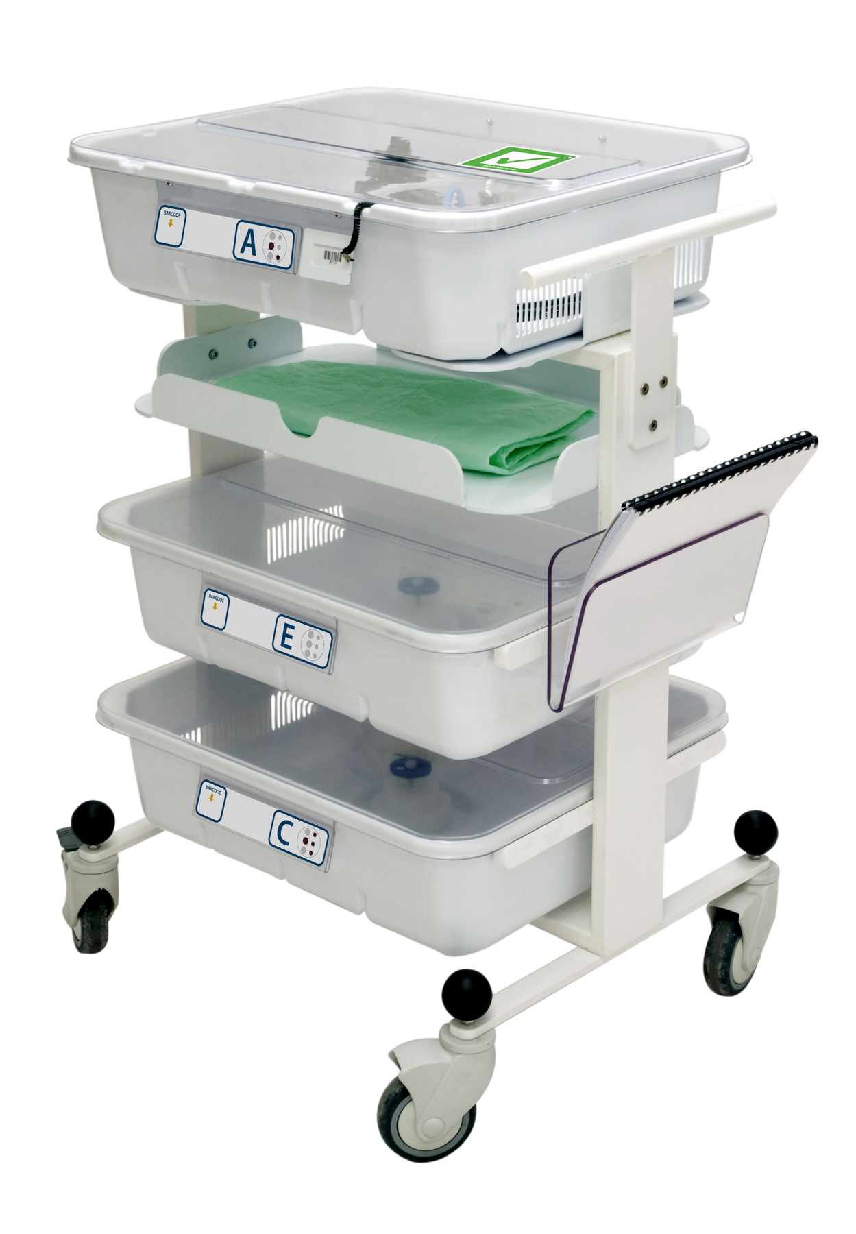 Flexibel transport anpassad för att transportera prober mellan undersökningsrum och sköljrum. Vagnen kan utrustas med upp till 4st. förvaringslådor. Vagnen är även designad för att den lätt ska kunna rengöras och desinficeras. Till lådorna finns ett smart etikettsystem för att tydliggöra vilka prober som är rena och vilka som är orena.